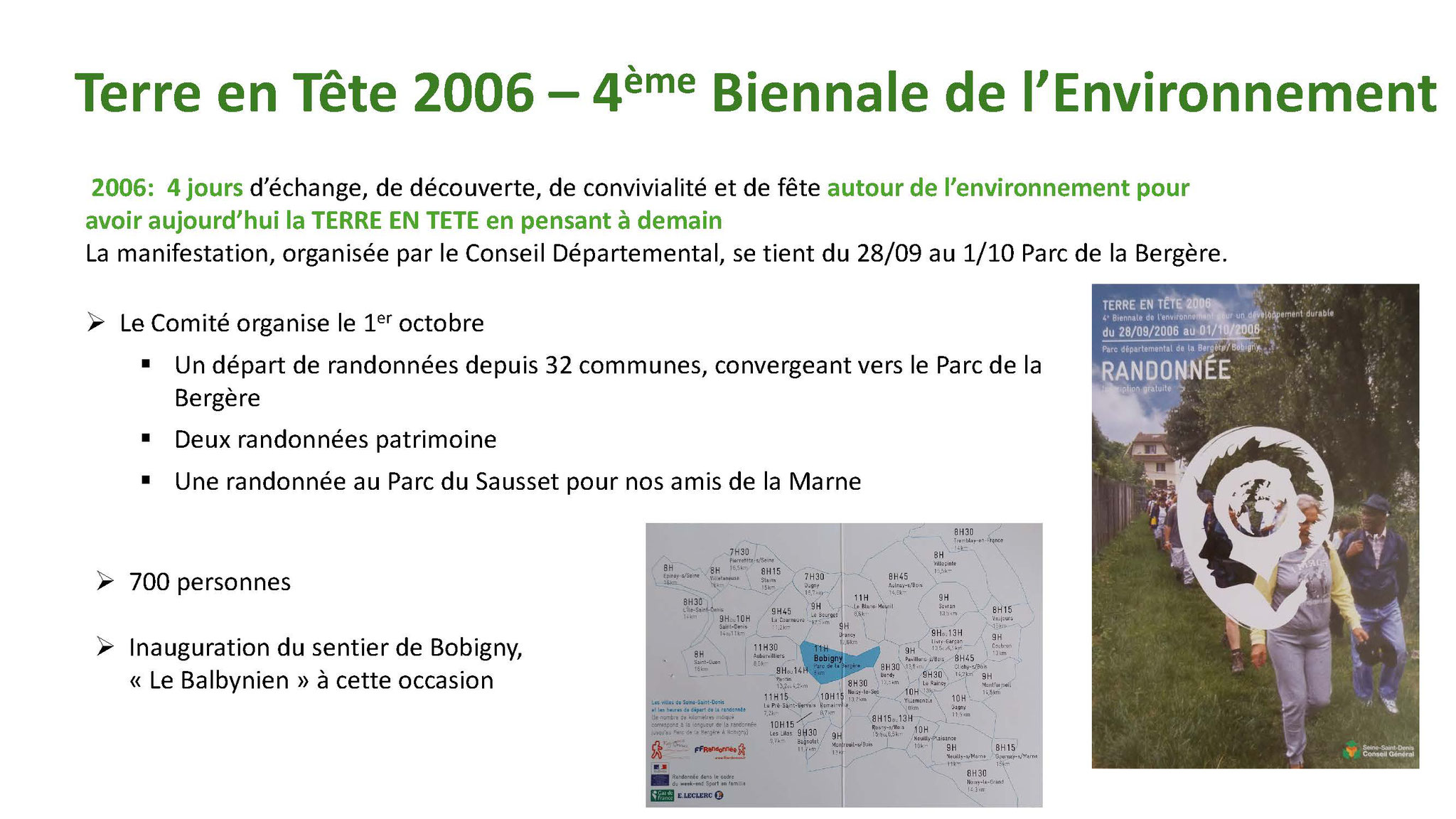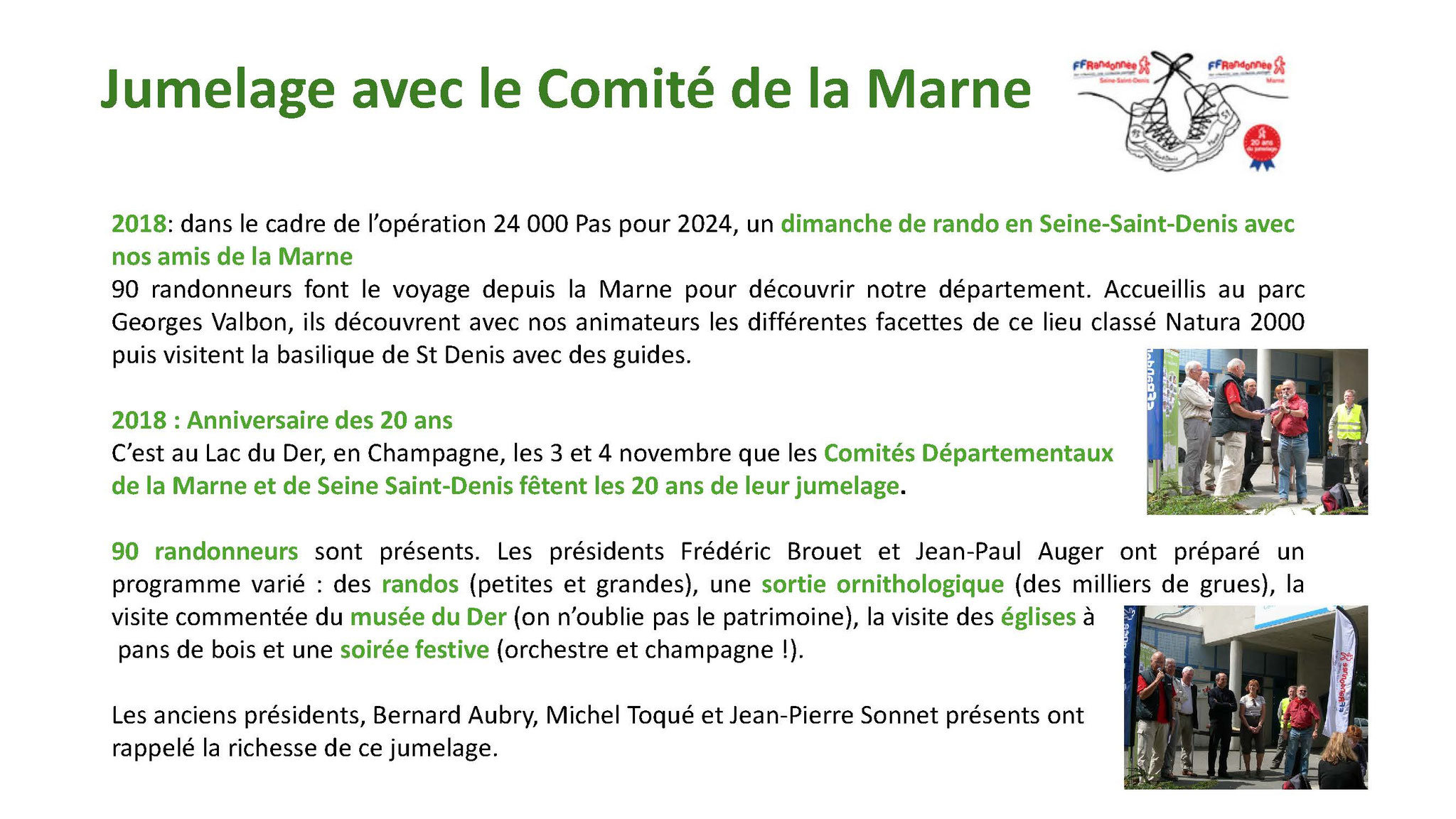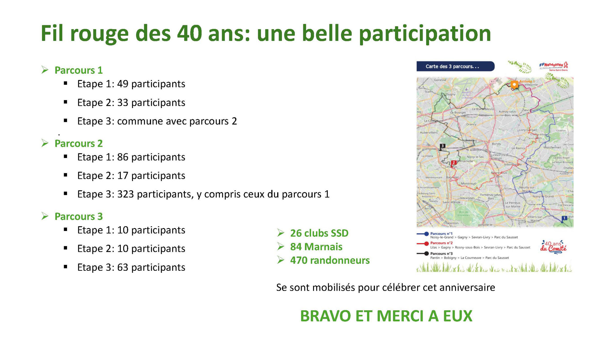 Plusieurs Clubs ont participé à ces différents parcours. Le jour de l’anniversaire environ 420 randonneurs dont 84 Marnais se sont retrouvés à la gare de Sevran-Livry et un autre groupe de 50 de la gare de Dugny pour converger vers le Sausset.