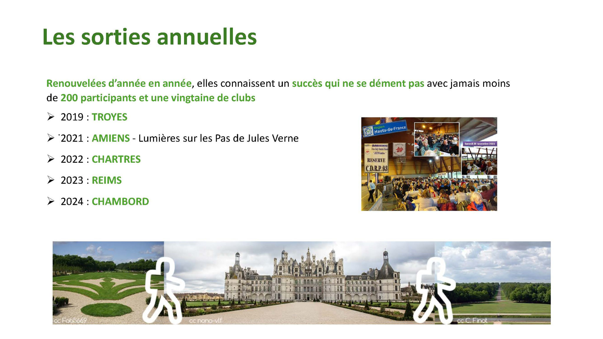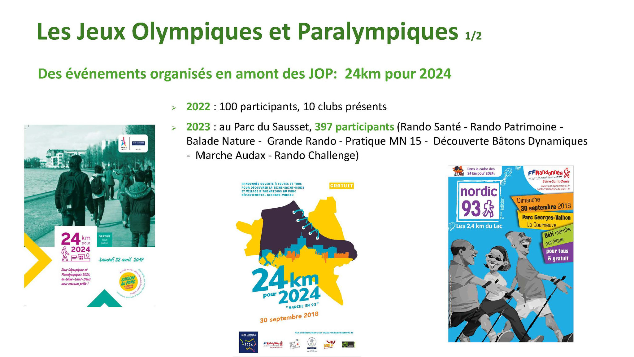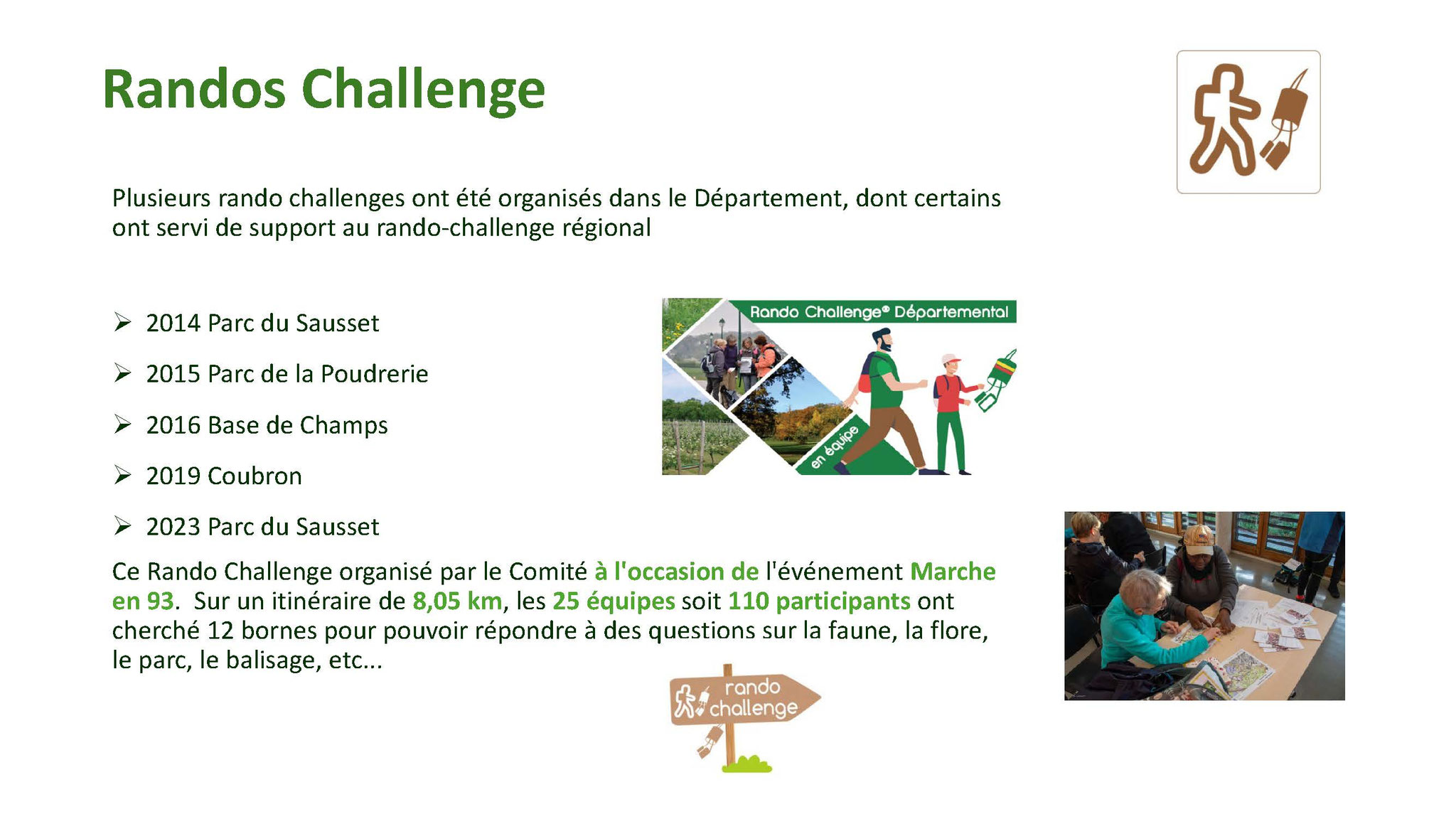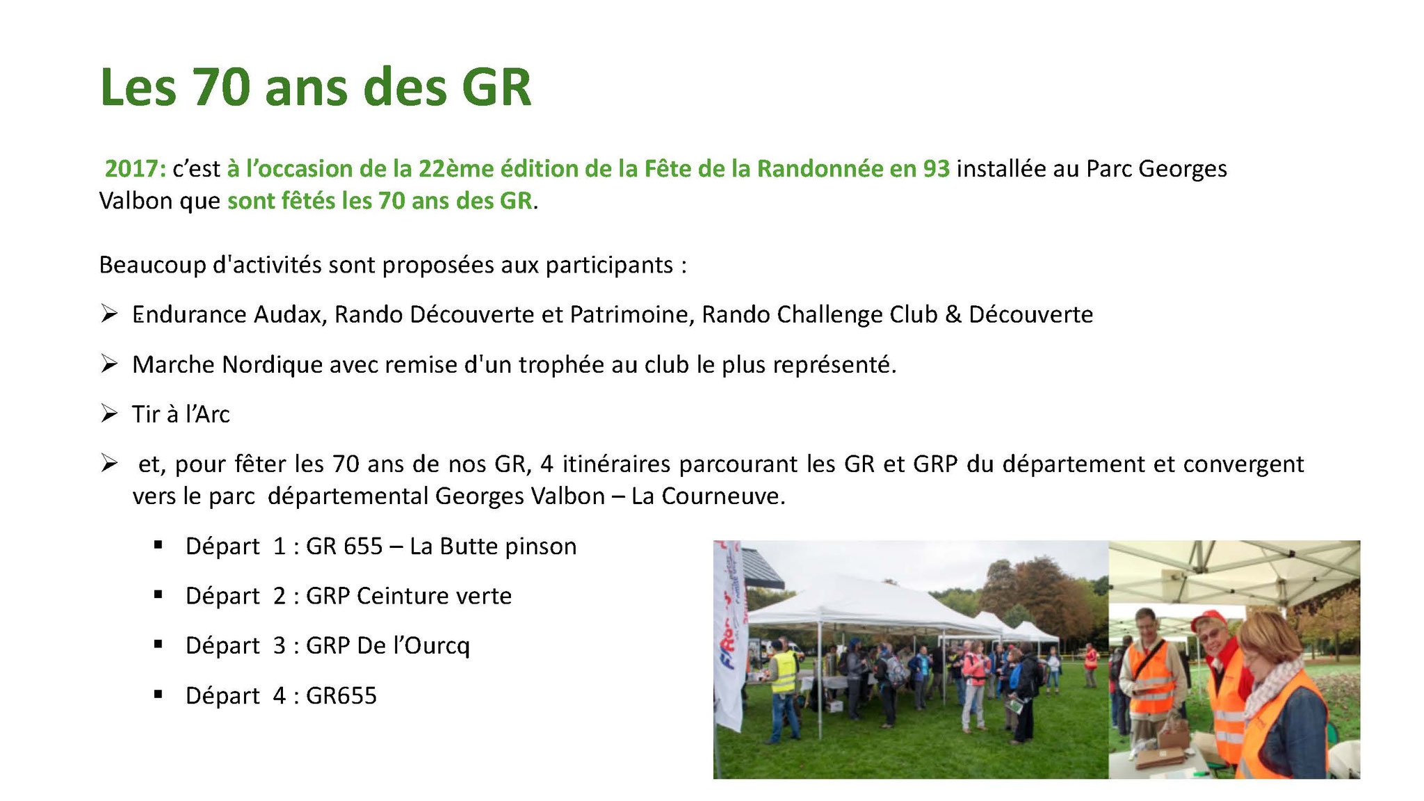 Plusieurs Clubs ont participé à ces différents parcours. Le jour de l’anniversaire environ 420 randonneurs dont 84 Marnais se sont retrouvés à la gare de Sevran-Livry et un autre groupe de 50 de la gare de Dugny pour converger vers le Sausset.